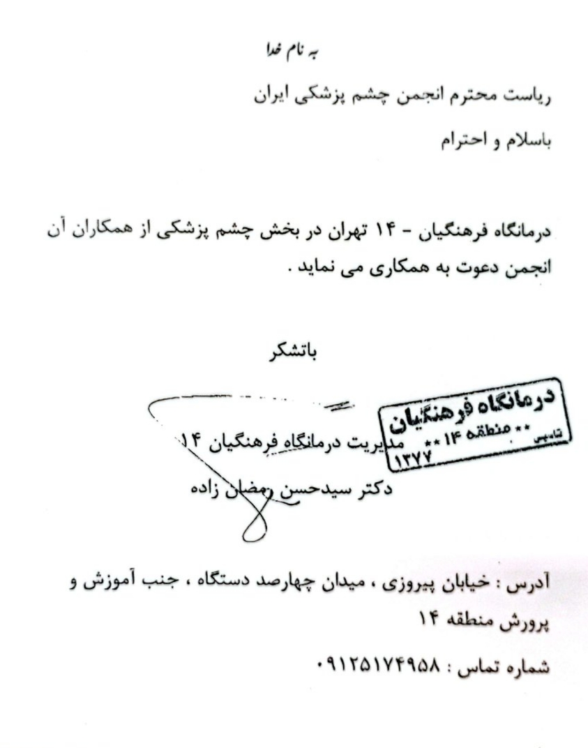 تاریخ: 1404/05/01 عنوان: درمانگاه فرهنگیان دعوت به همکاری از چشم پزشکان محترم در درمانگاه فرهنگیان آدرس: خ پیروزی تلفن: 09125174958